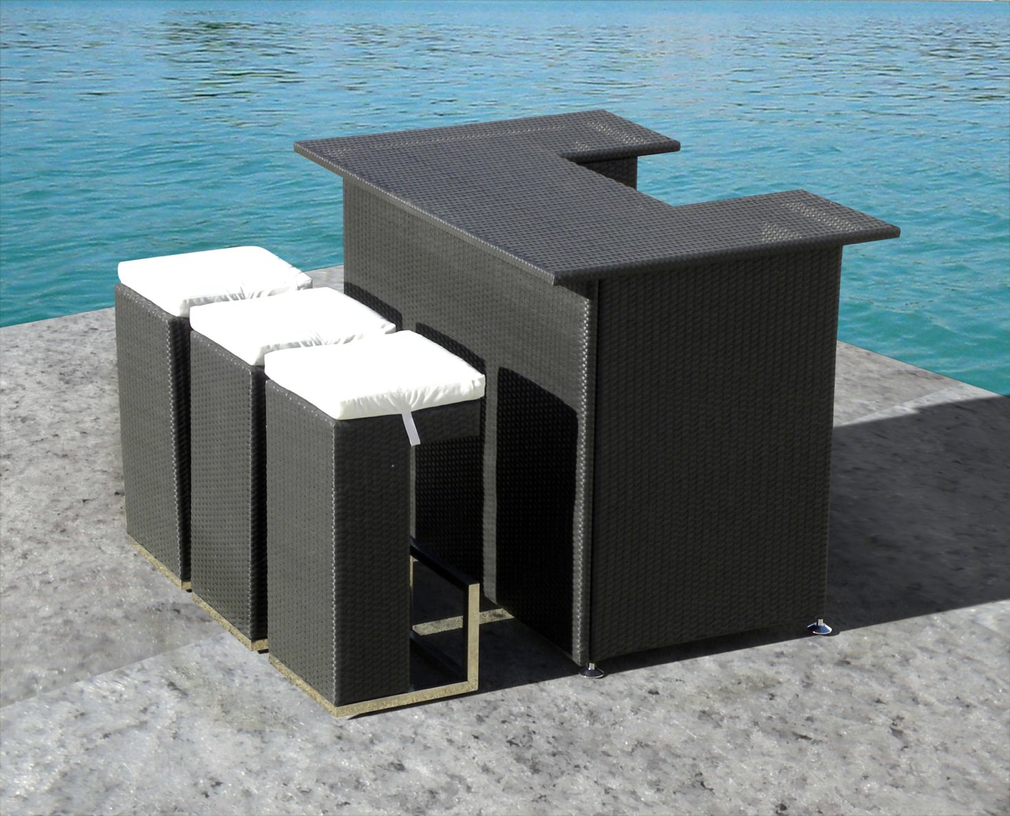 For a relaxed poolside feel consider this Outdoor Wicker Patio Furniture New Resin 4 Pc Bar Dining Server Table and Barstool Set